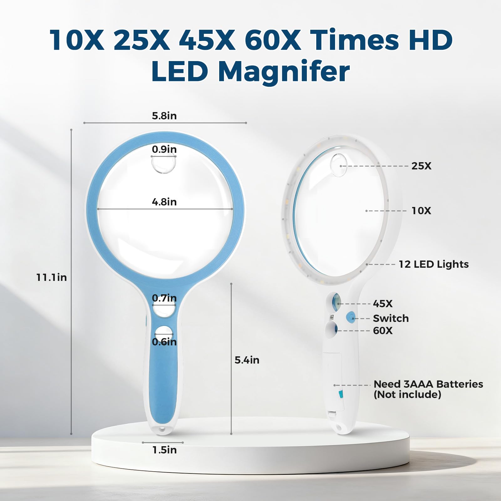 Nazano Large Magnifying Glass with Light,10X 25X 45X 60X Handheld Illuminated Lighted Magnifier, 5in Page Reading Magnifier with 12 LED Lights for Seniors Reading, Coins, Jewelry, Close Work – Blue