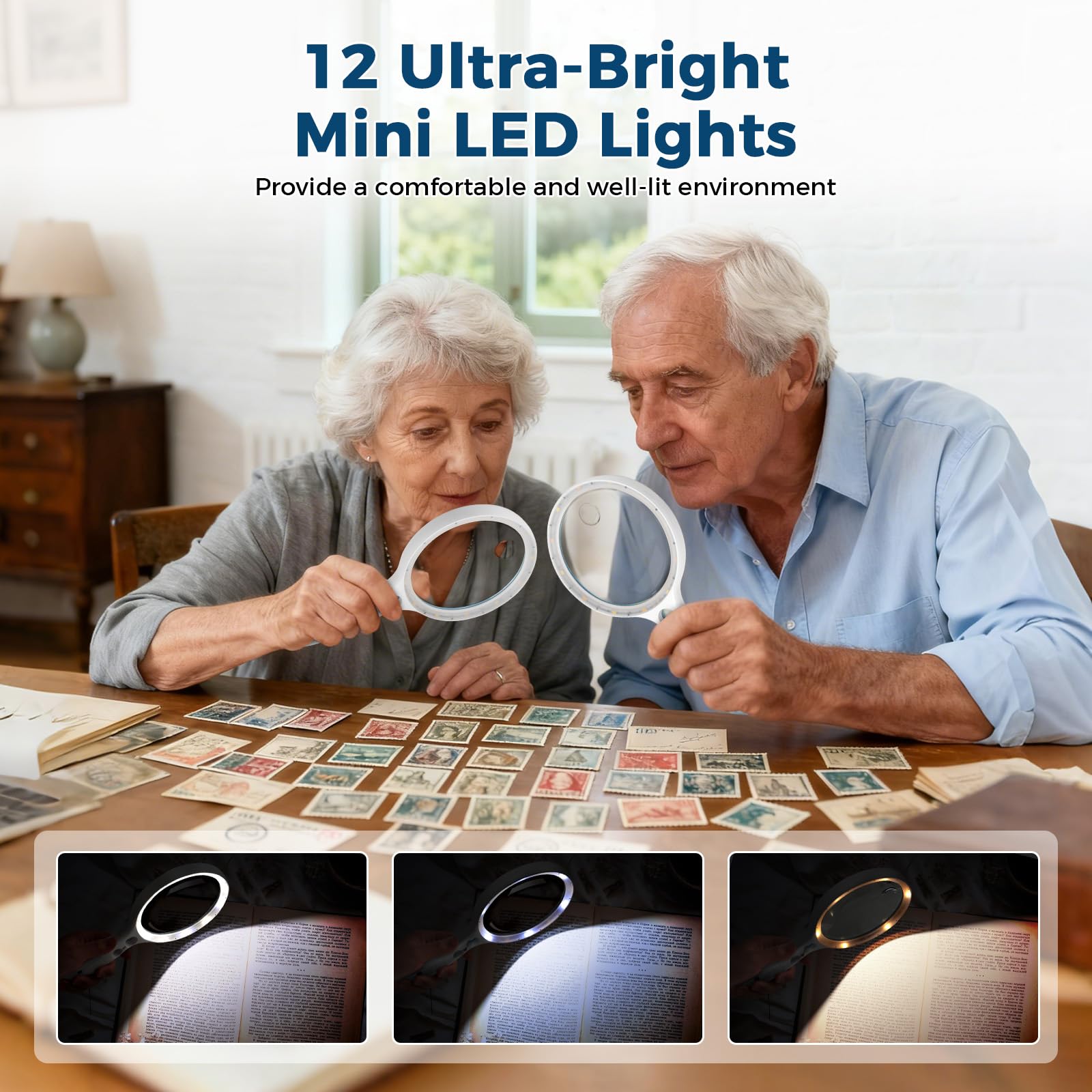 - 3 Color Modes & LED Brightness: This magnifying glass with 12 Led lights provide adjustable color temperature Illuminated LED lights, with 3 different color temperatures available, it can illuminate the entire book, which is the most suitable temperatures & brightness to read in dark for a long time comfortably.