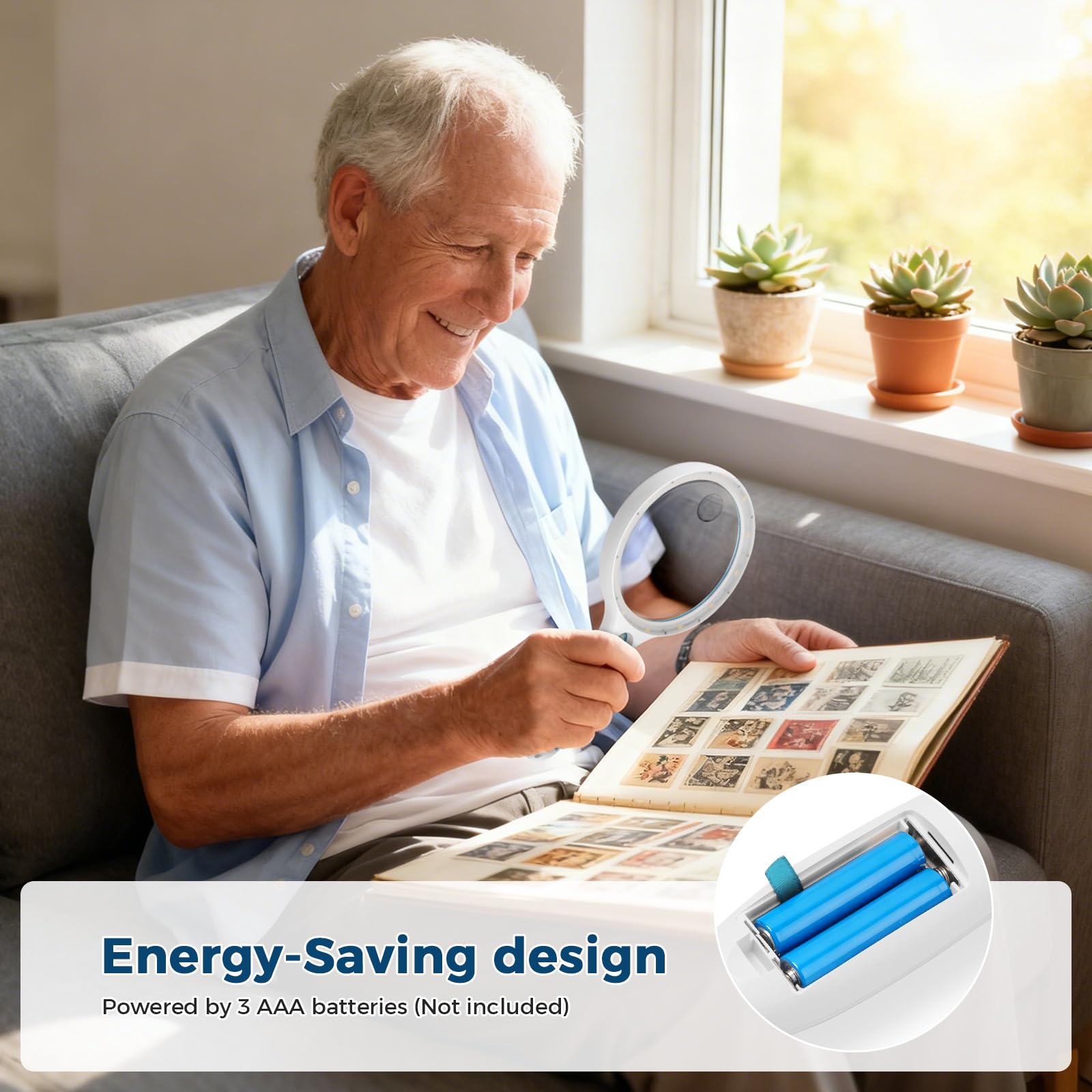 - Easy to Use: This lighted magnifying glass is easy to operate with a simple ON / OFF button switch, 3 AAA batteries (not included), long-lasting power supply, avoid the trouble of frequent battery replacement. It can also be used as an emergency light source in case of emergency and the extended handle design for long-term holding making it perfect for the elderly or those requiring an intuitive magnification system.